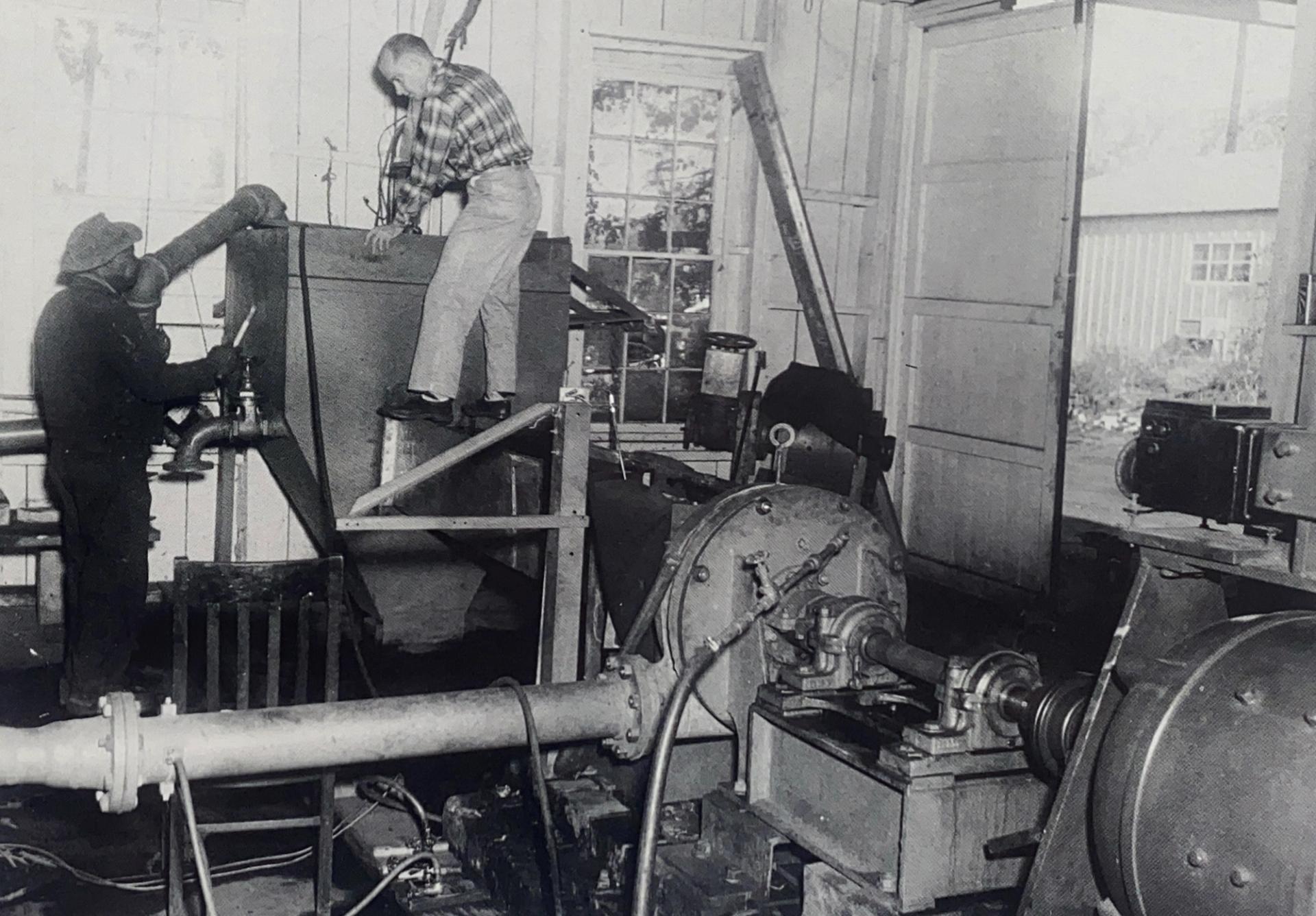 1950's-Tom Hagler, Jr. (on right) + Pierce Thompkins running a pump test in the hydraulic lab.