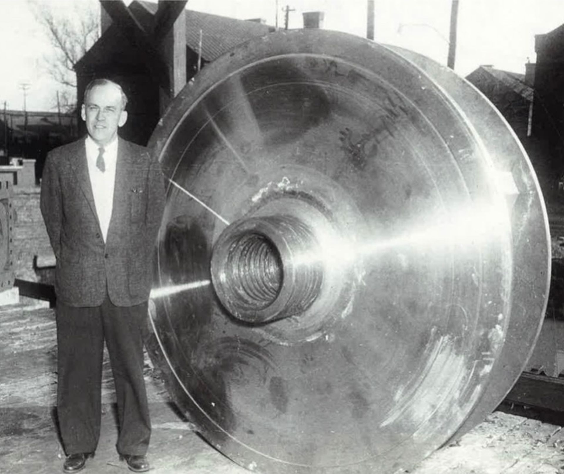 Tom Hagler, Sr. standing next to a large impeller for a double-wall dredge pump